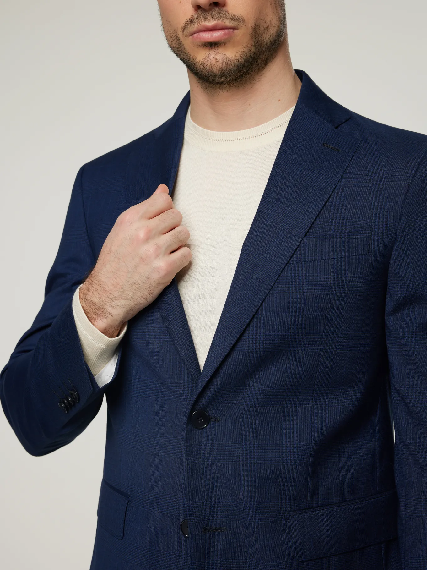 Unser Model misst 187 cm und trägt Grösse 48.
