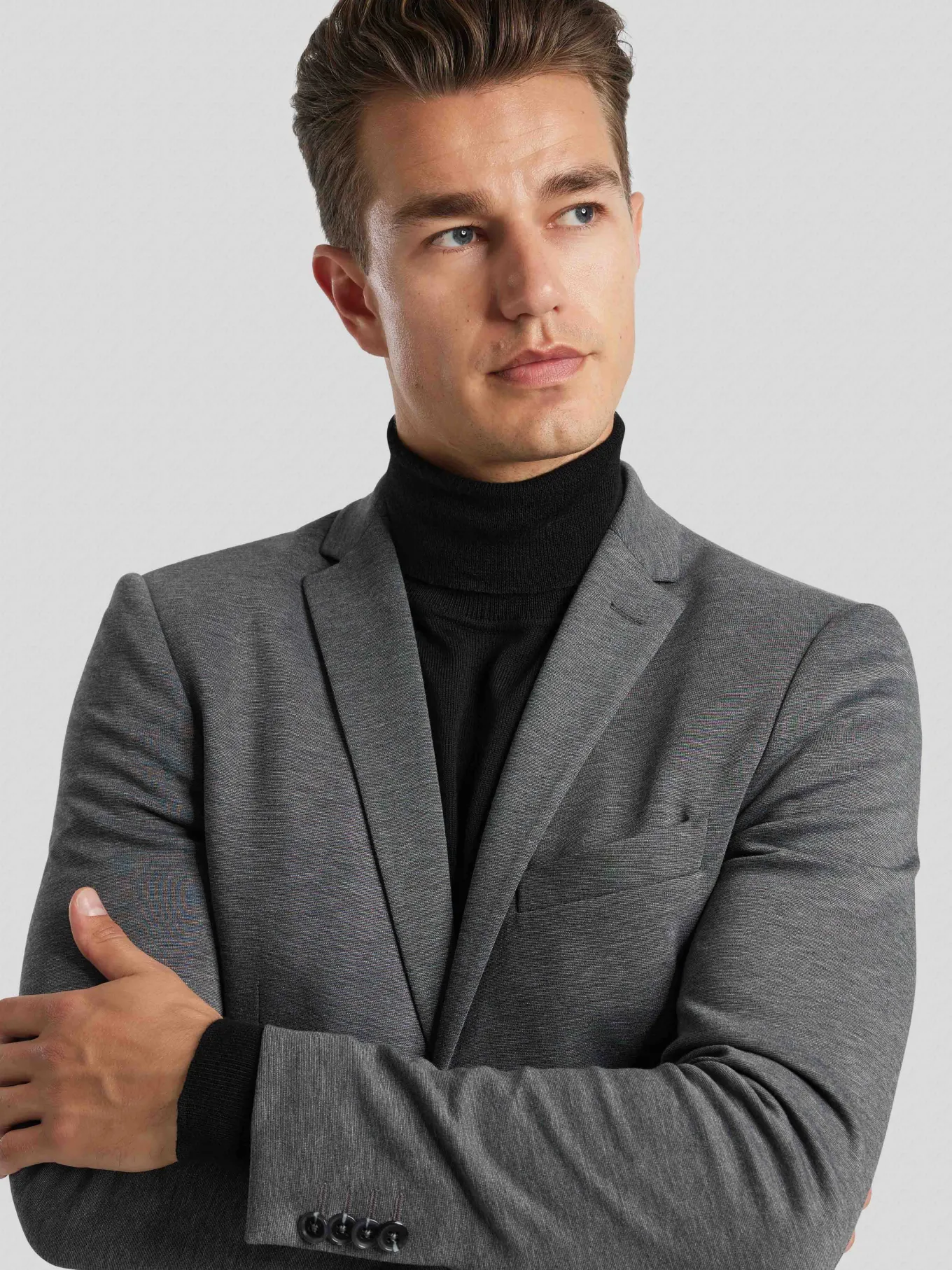 Unser Model misst 187 cm und trägt Grösse 48.