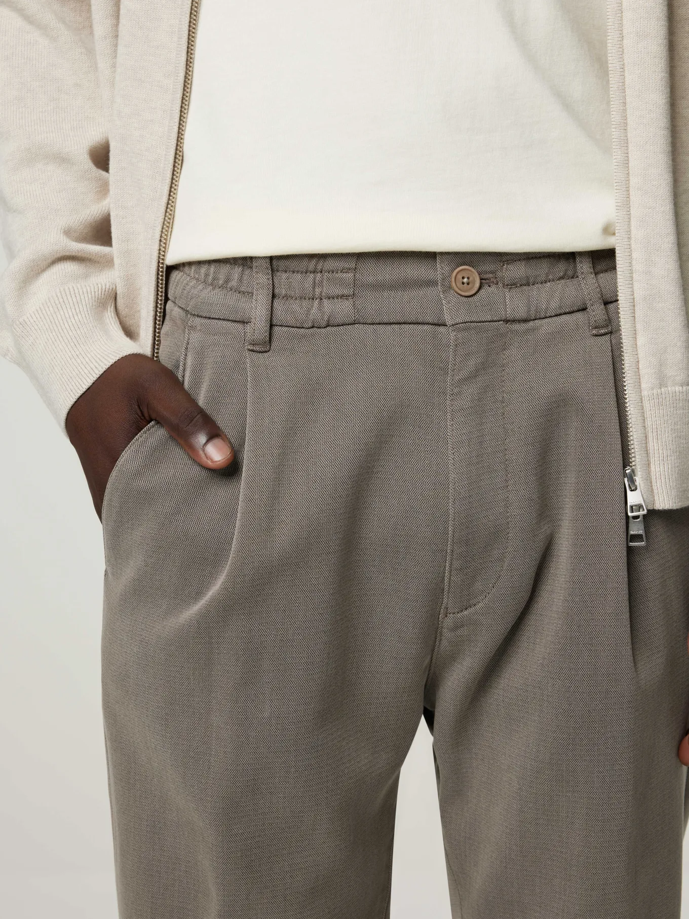 Verschliessbar durch: Verdeckter Reissverschluss mit Knopf , Elastischer Bund