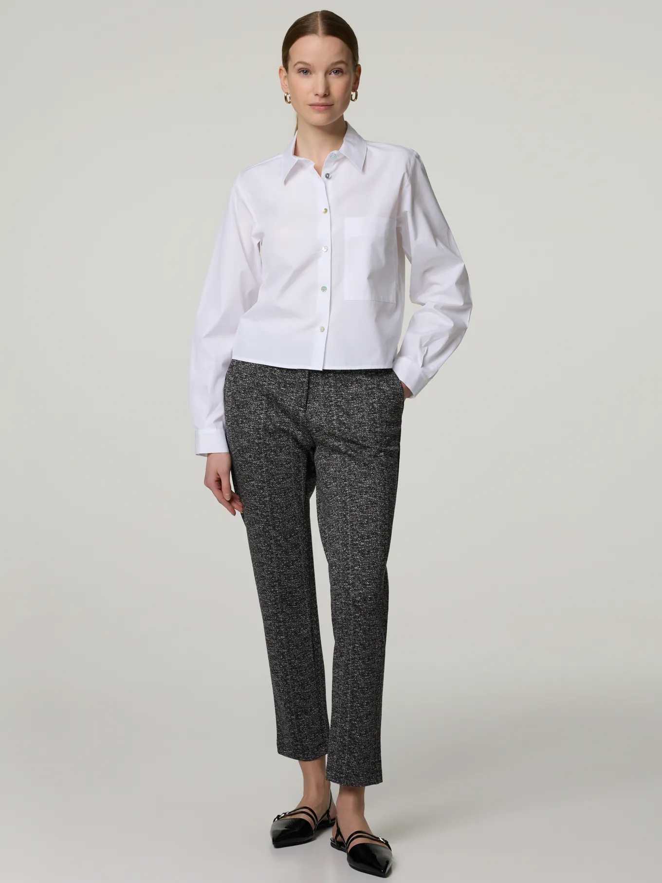 Unser Model misst 174 cm und trägt Grösse 36.