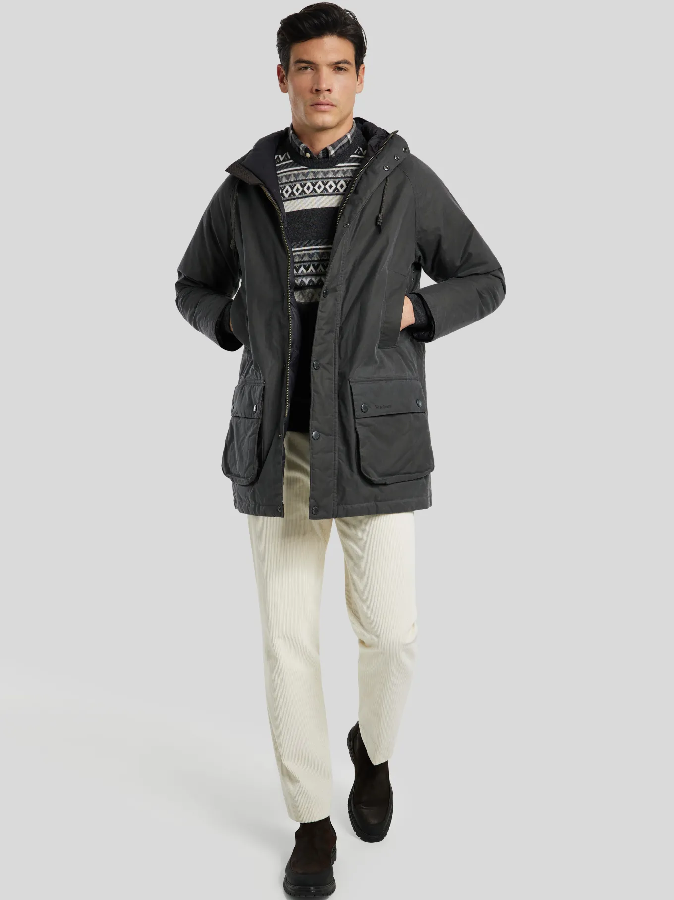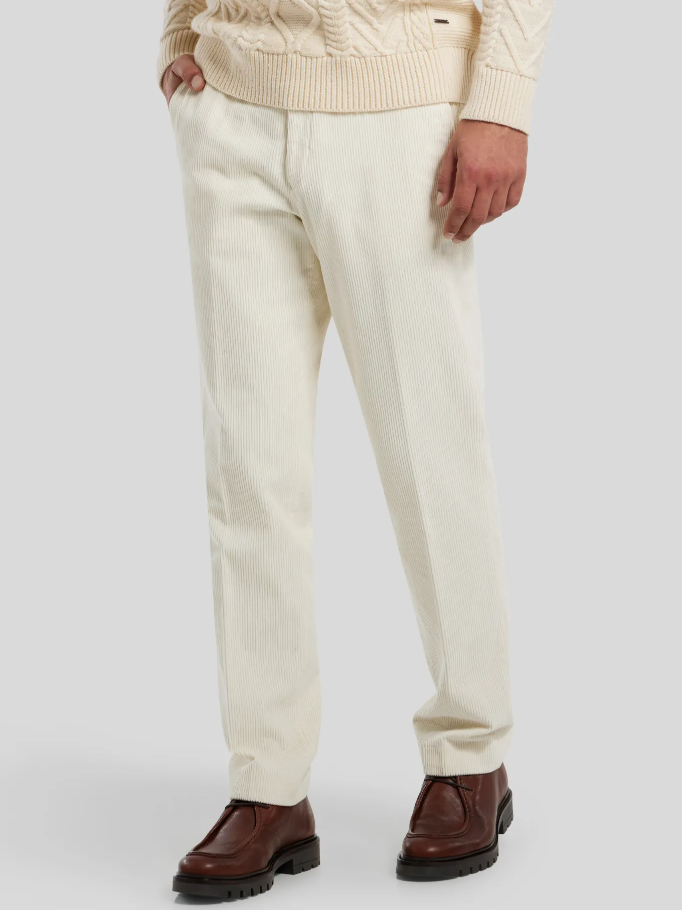 Unser Model misst 187 cm und trägt Grösse 48.