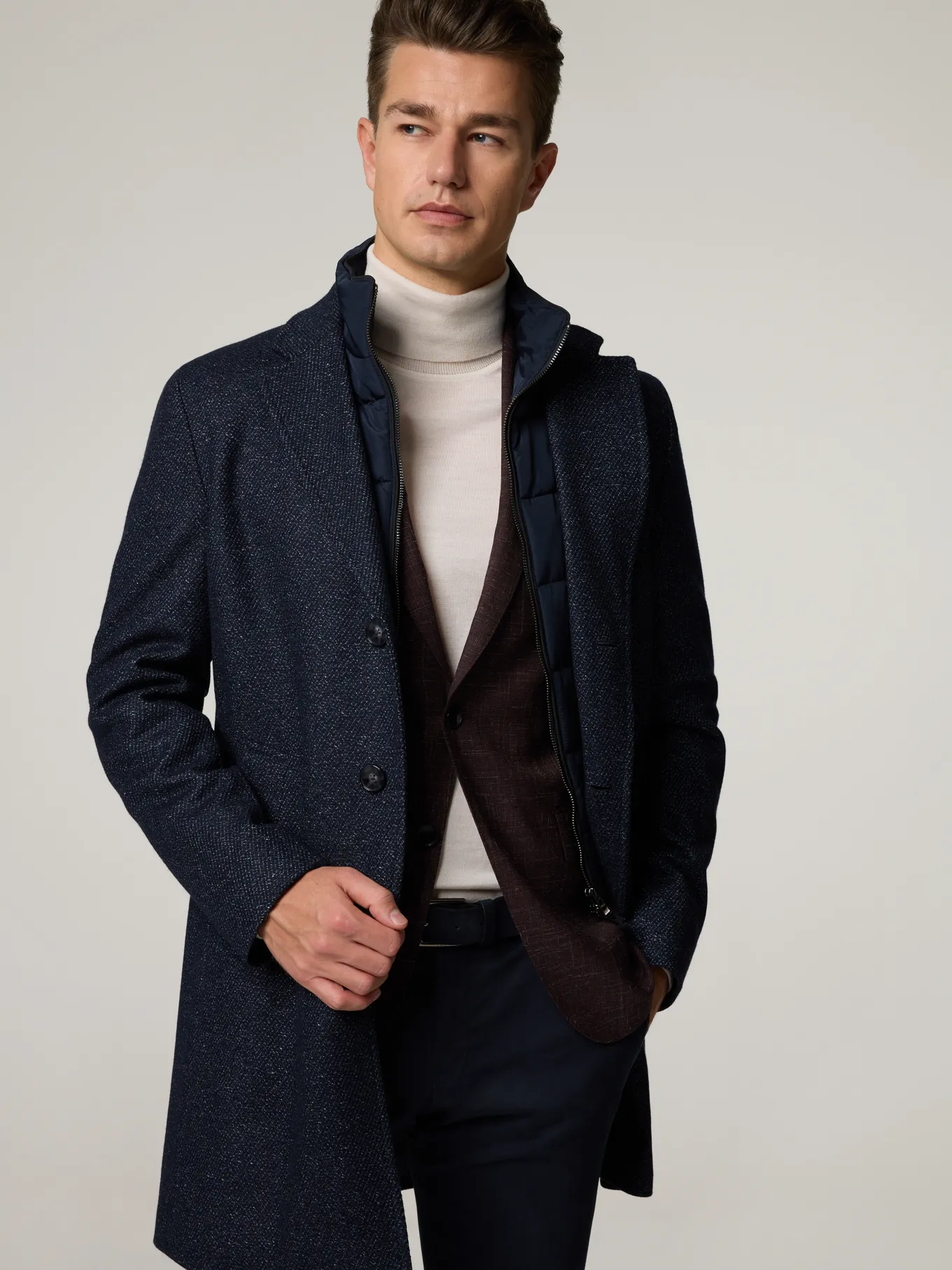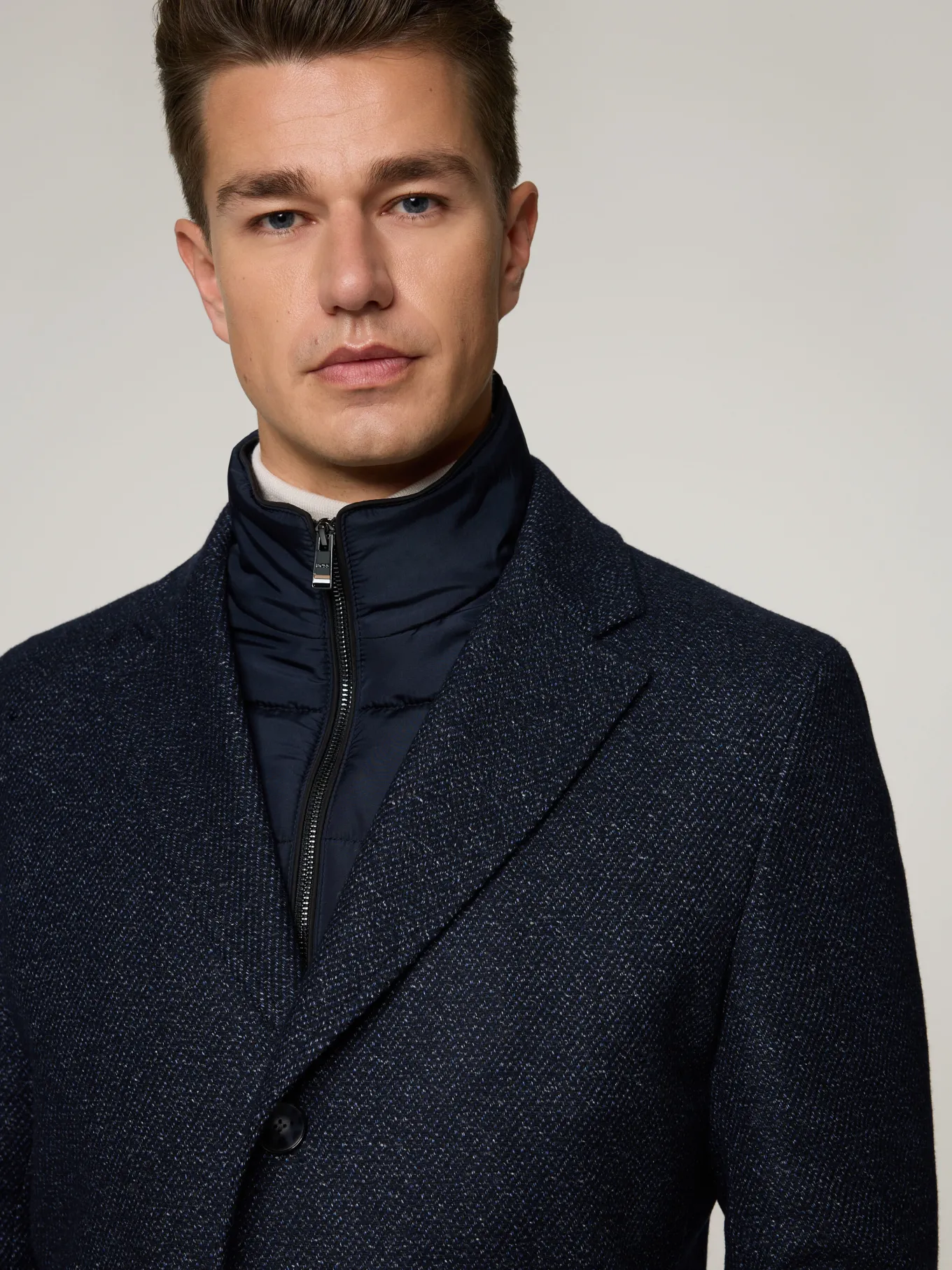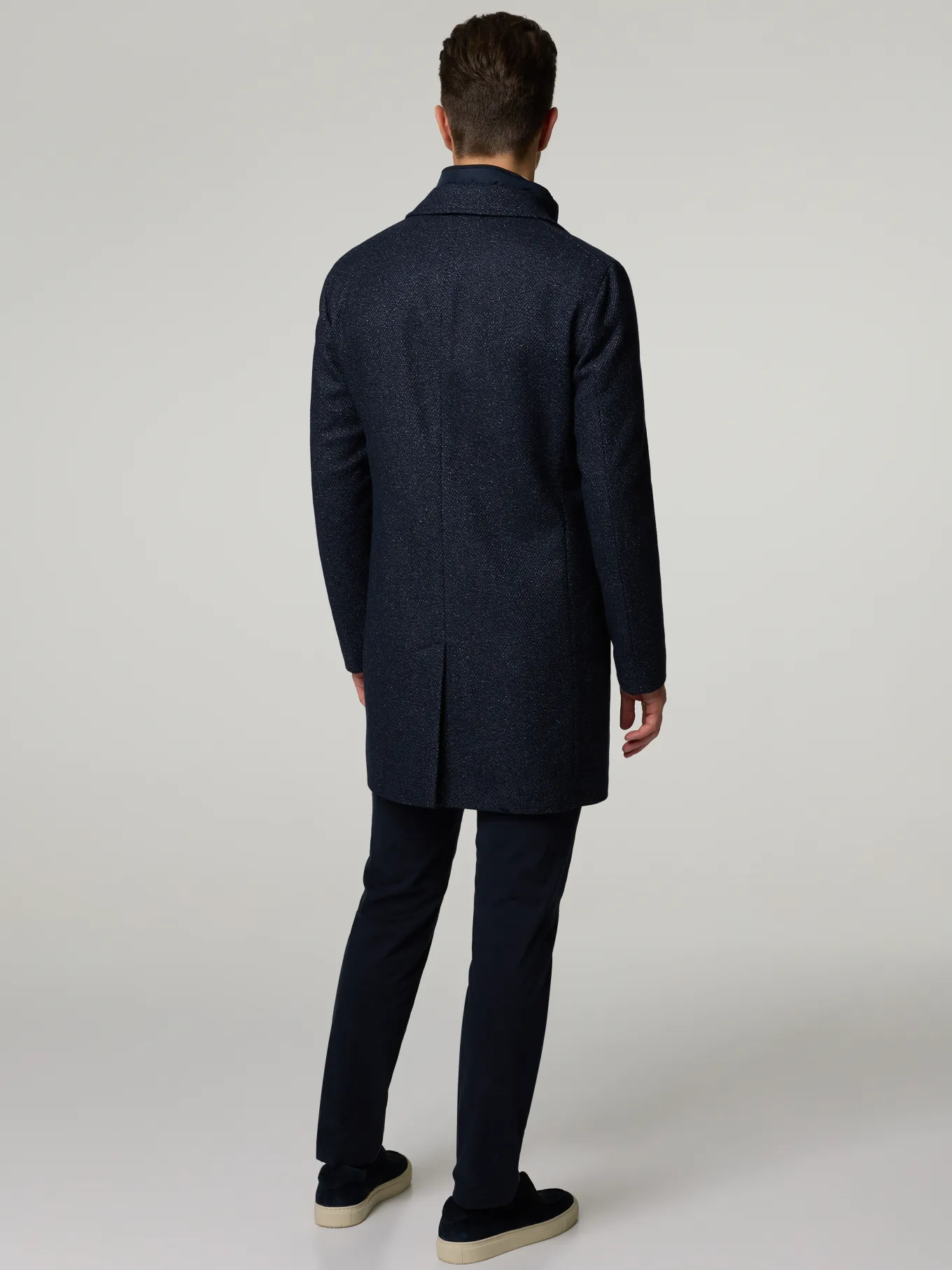 Unser Model misst 187 cm und trägt Grösse 48.