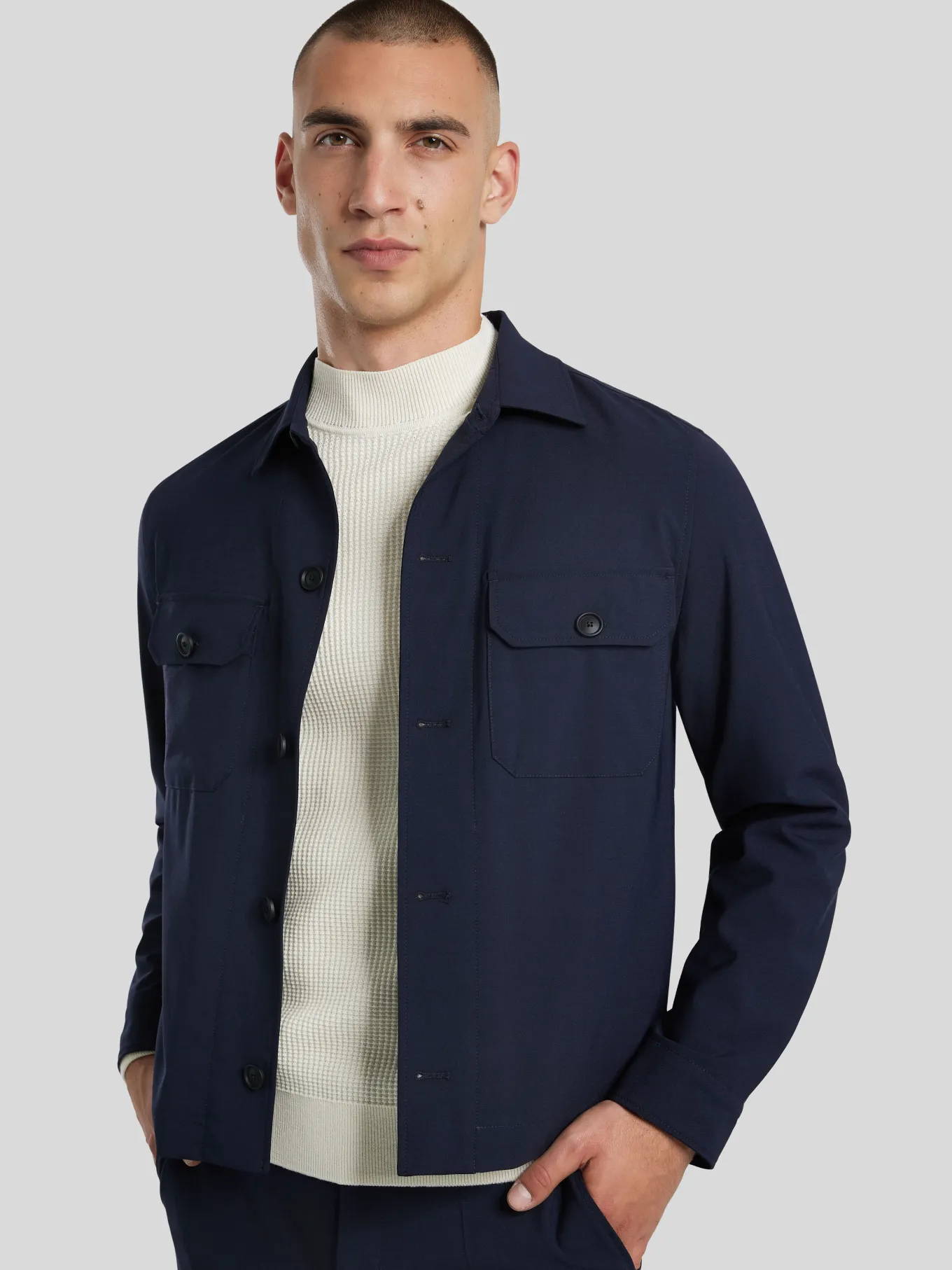 Unser Model misst 187 cm und trägt Grösse 48.