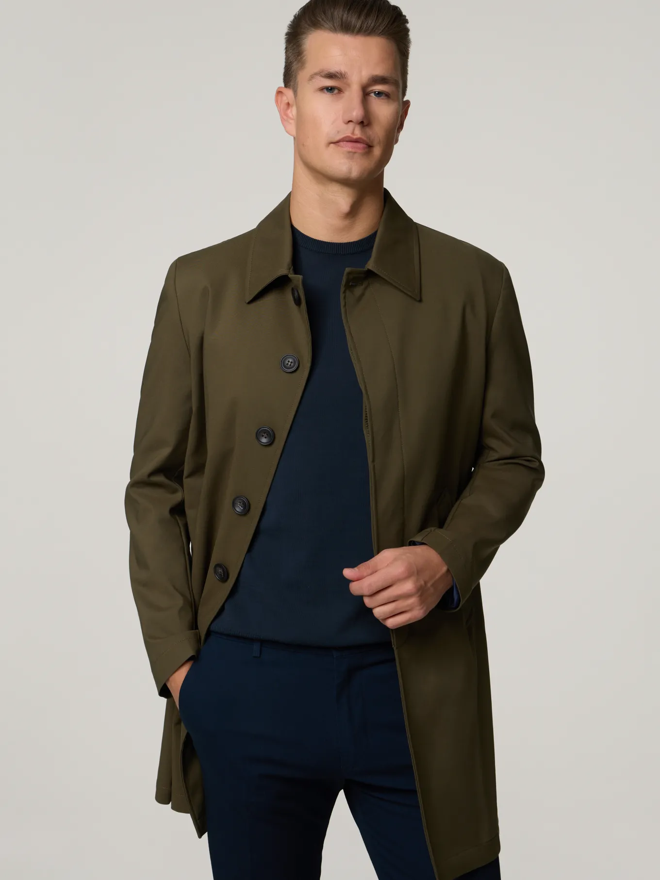 Unser Model misst 187 cm und trägt Grösse 50.