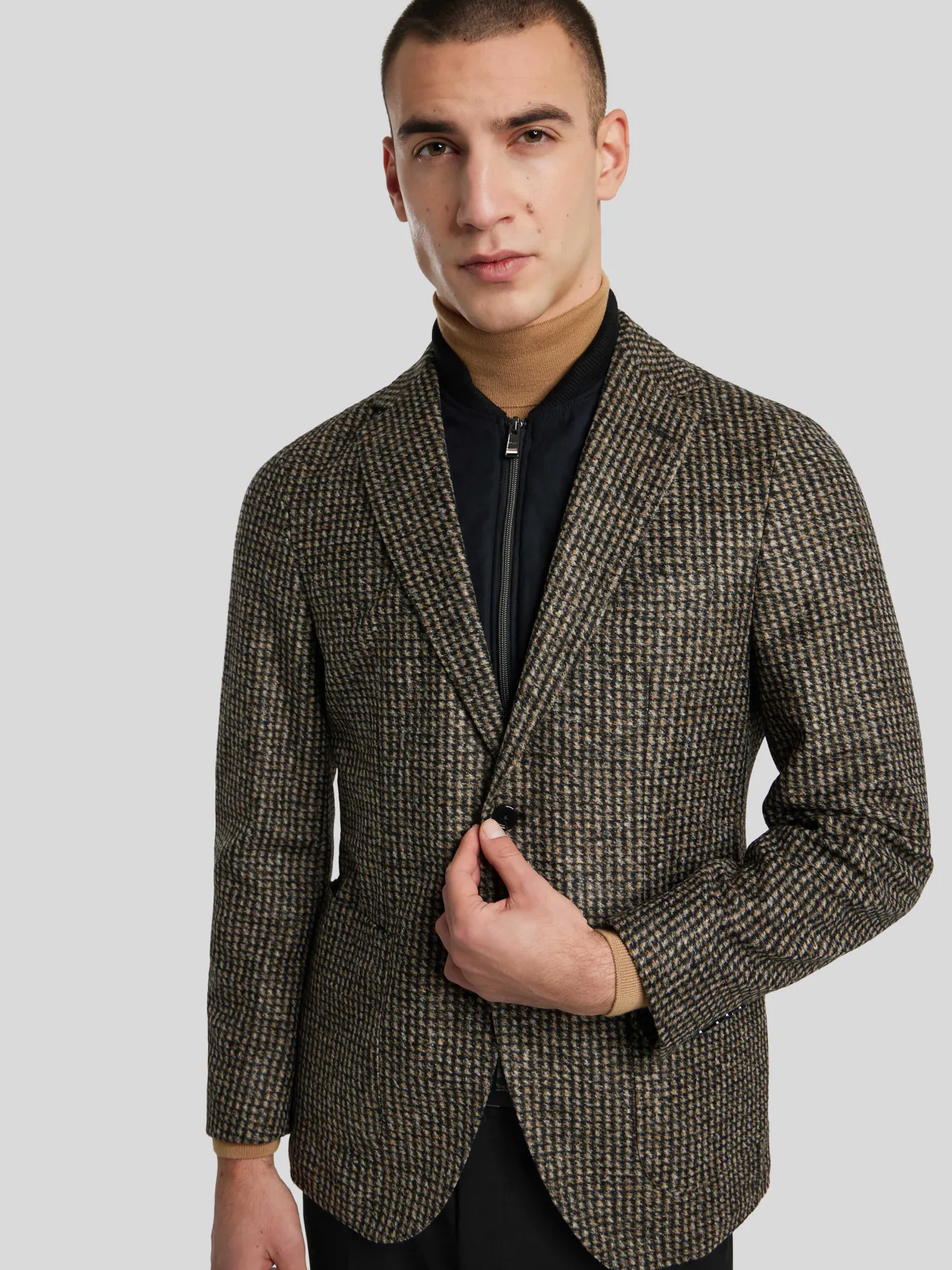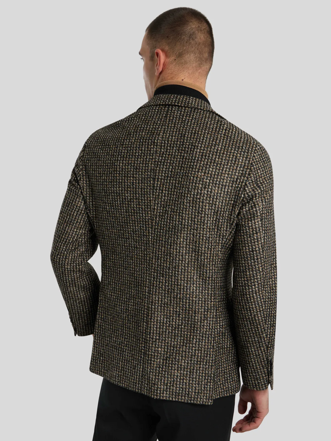 Unser Model misst 187 cm und trägt Grösse 48.