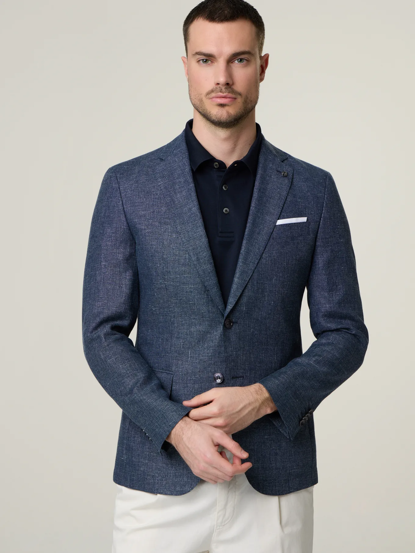 Unser Model misst 187 cm und trägt Grösse 48.