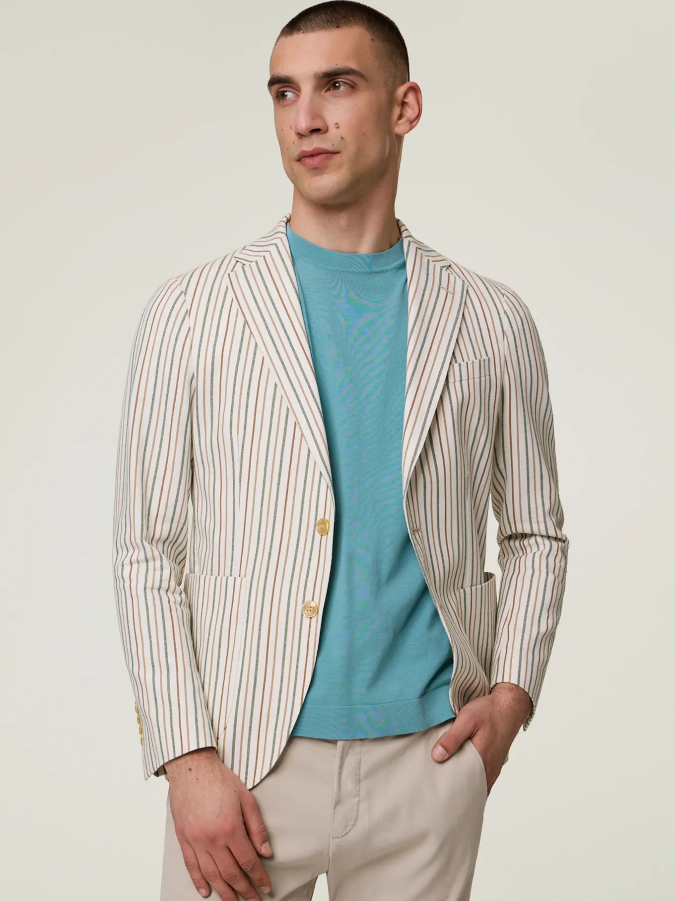 Unser Model misst 187 cm und trägt Grösse 50.