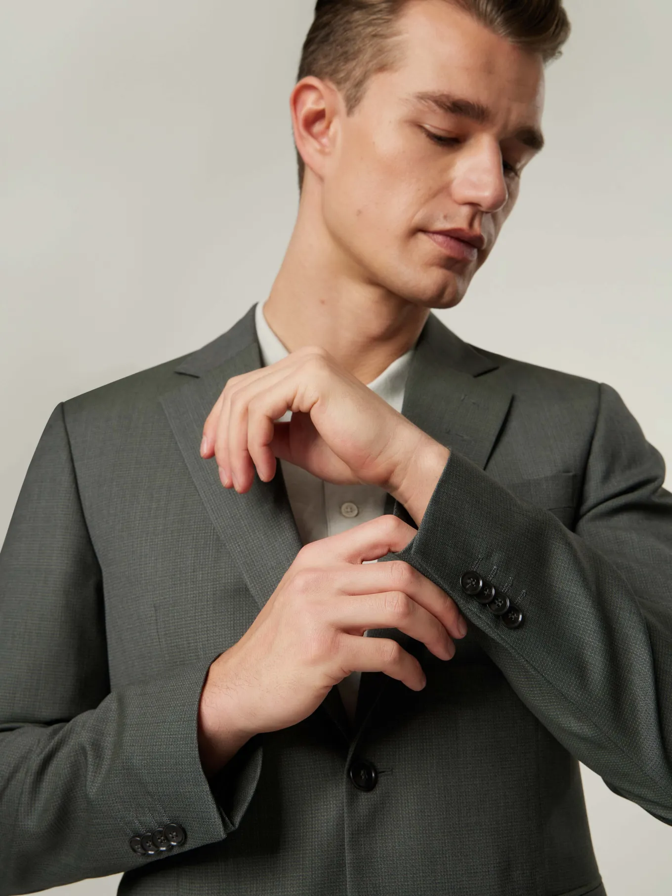 Unser Model misst 187 cm und trägt Grösse 48.