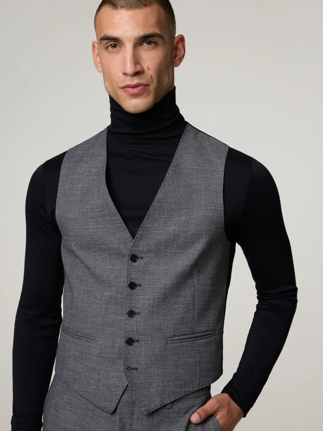 Unser Model misst 187 cm und trägt Grösse 50.