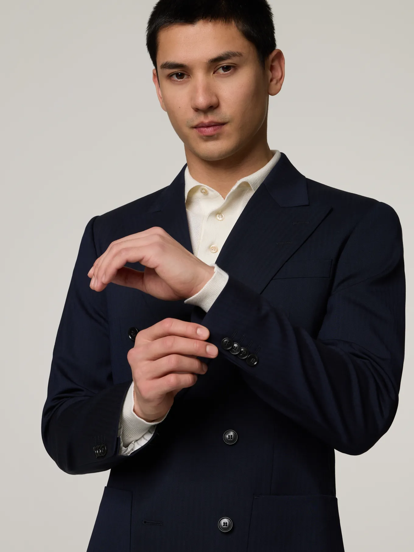 Unser Model misst 185 cm und trägt Grösse 48.