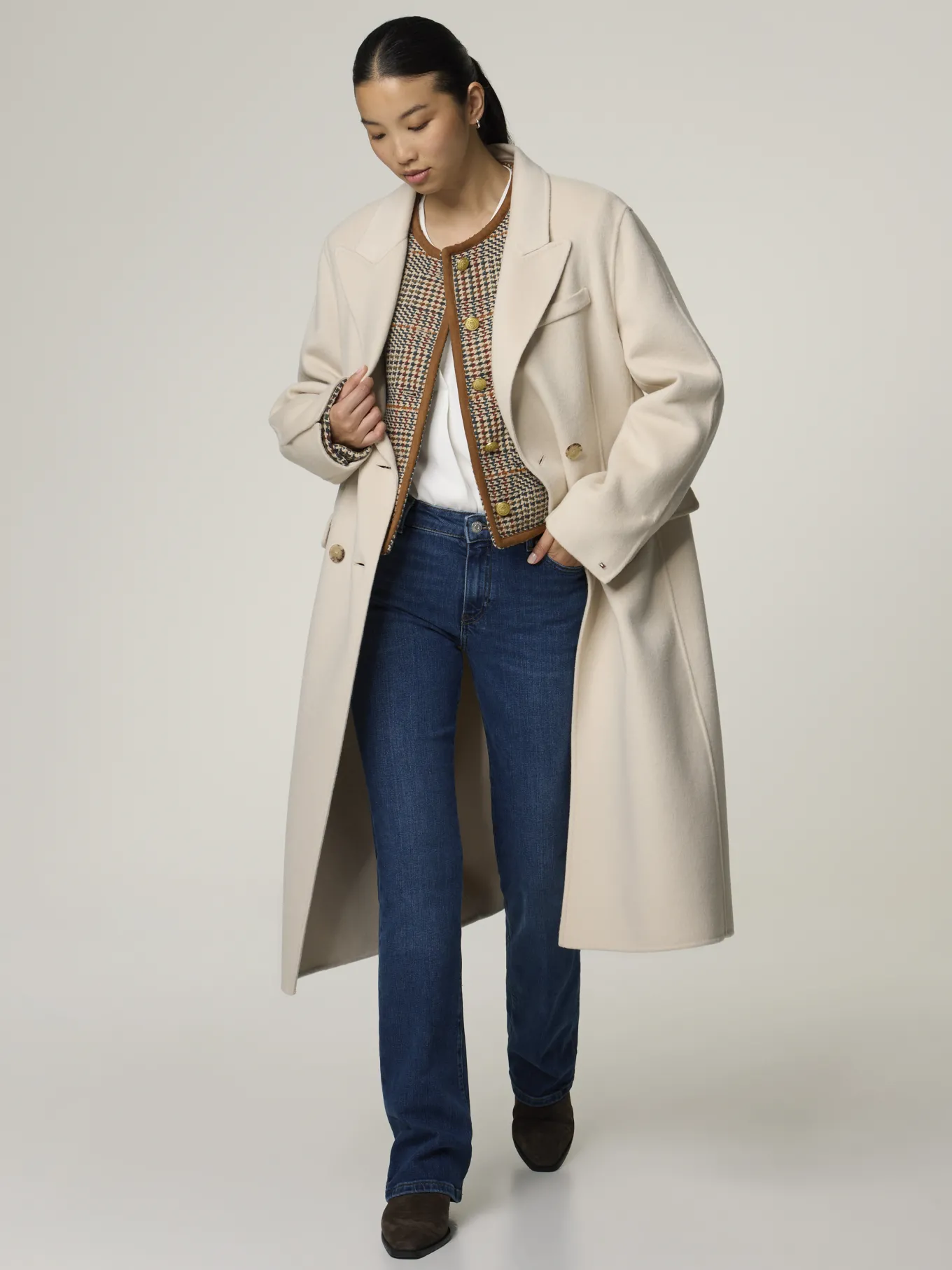 Unser Model misst 174 cm und trägt Grösse 36.