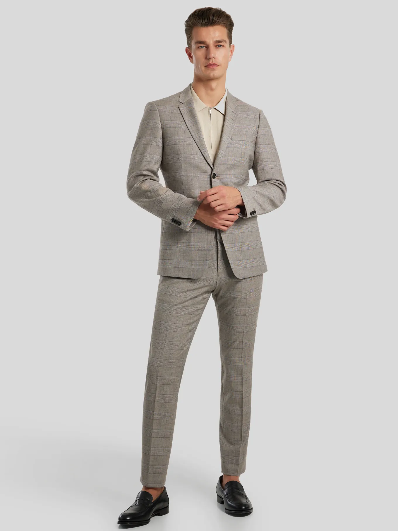 Unser Model misst 187 cm und trägt Grösse 48.