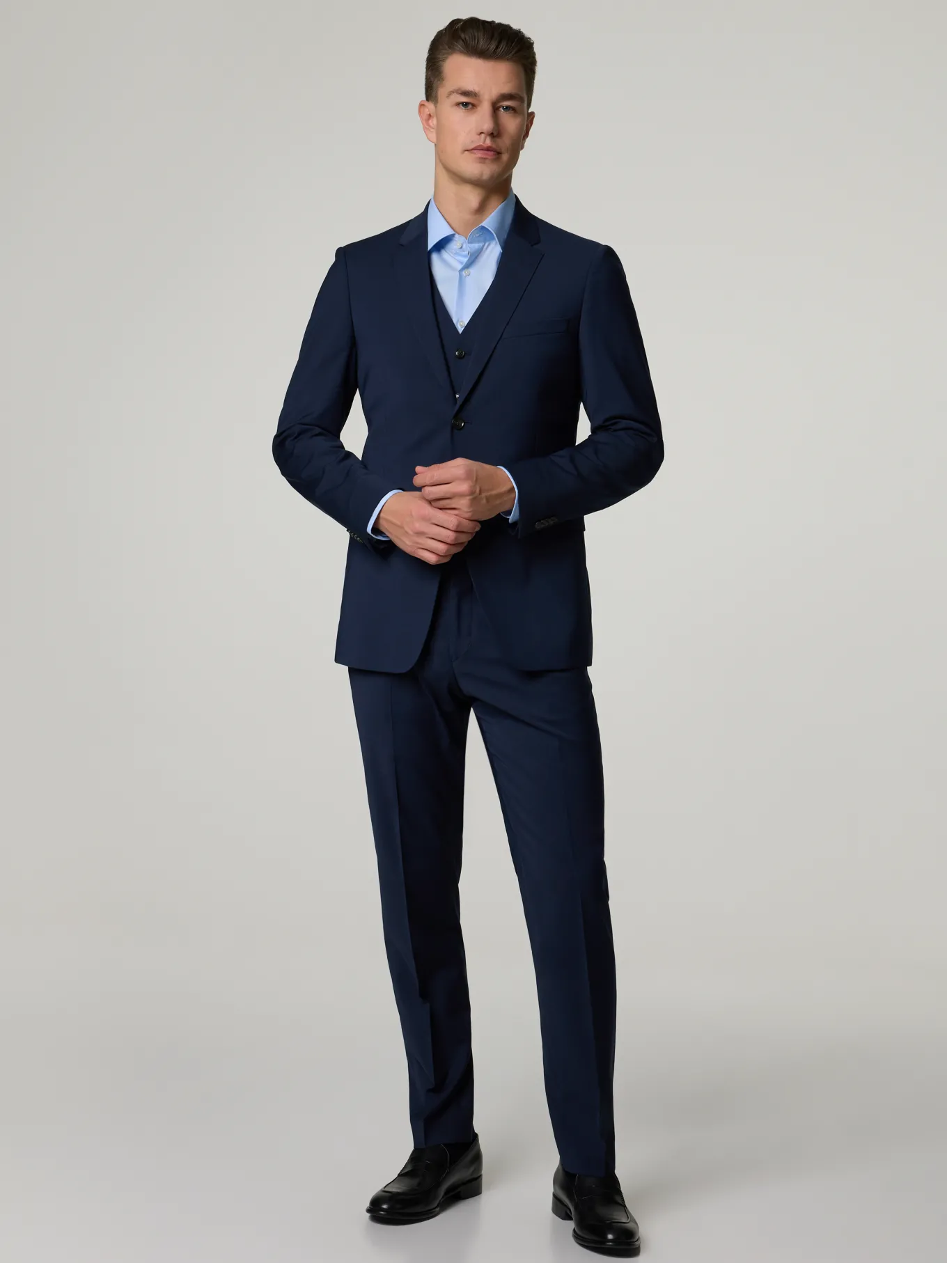 Unser Model misst 187 cm und trägt Grösse 48.