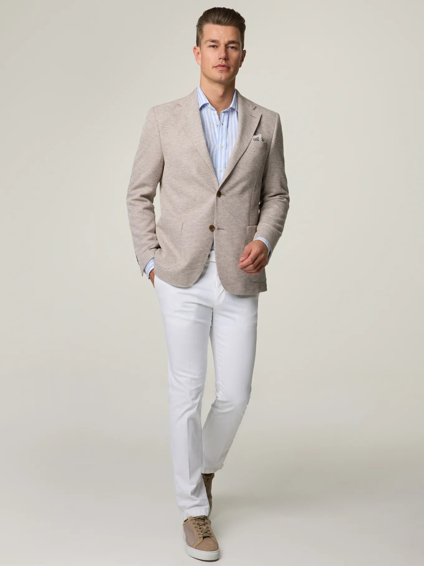 Unser Model misst 187 cm und trägt Grösse 48.