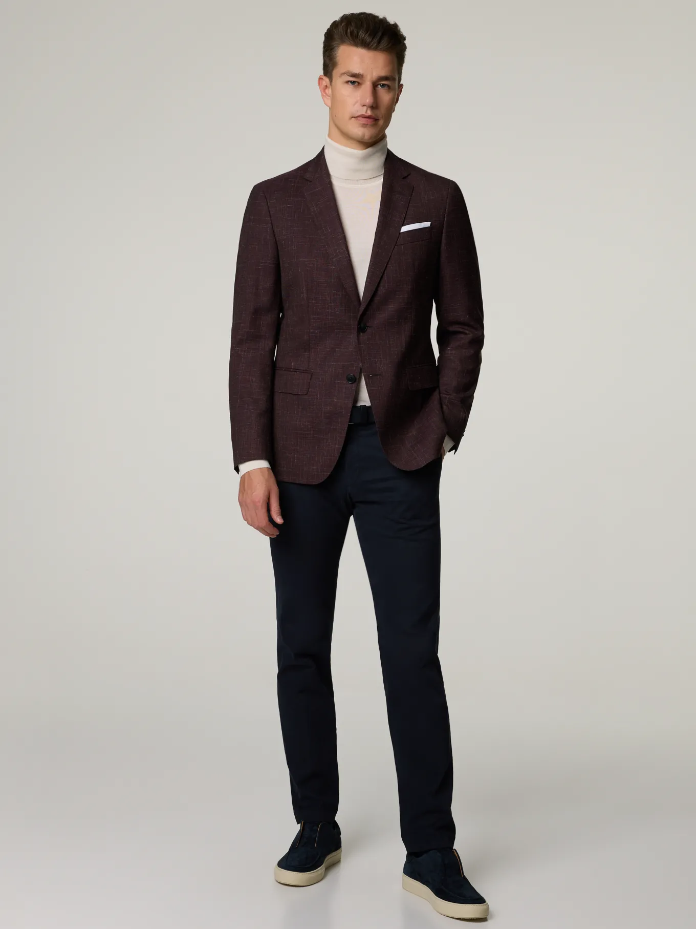Unser Model misst 187 cm und trägt Grösse 48.