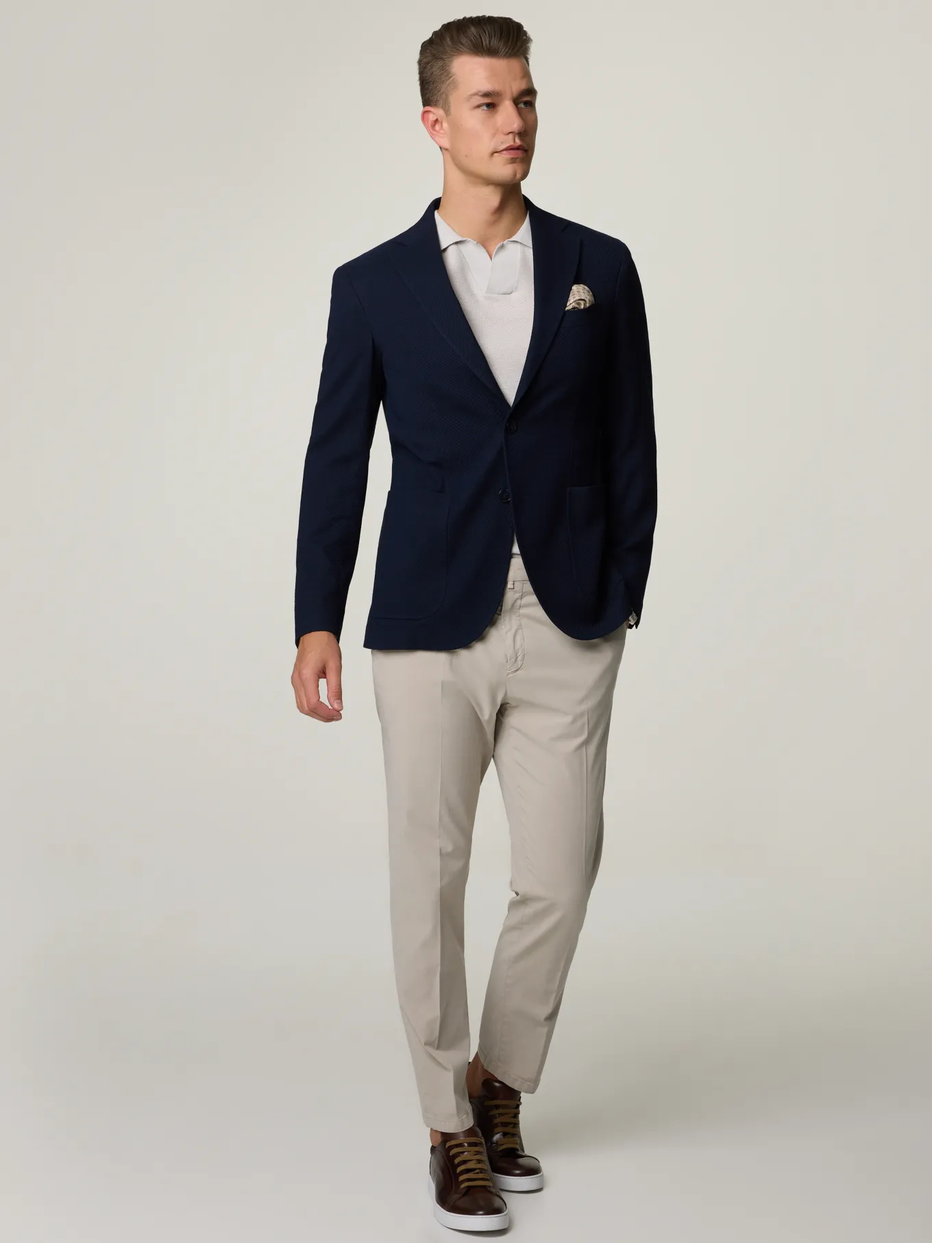Unser Model misst 187 cm und trägt Grösse 48.