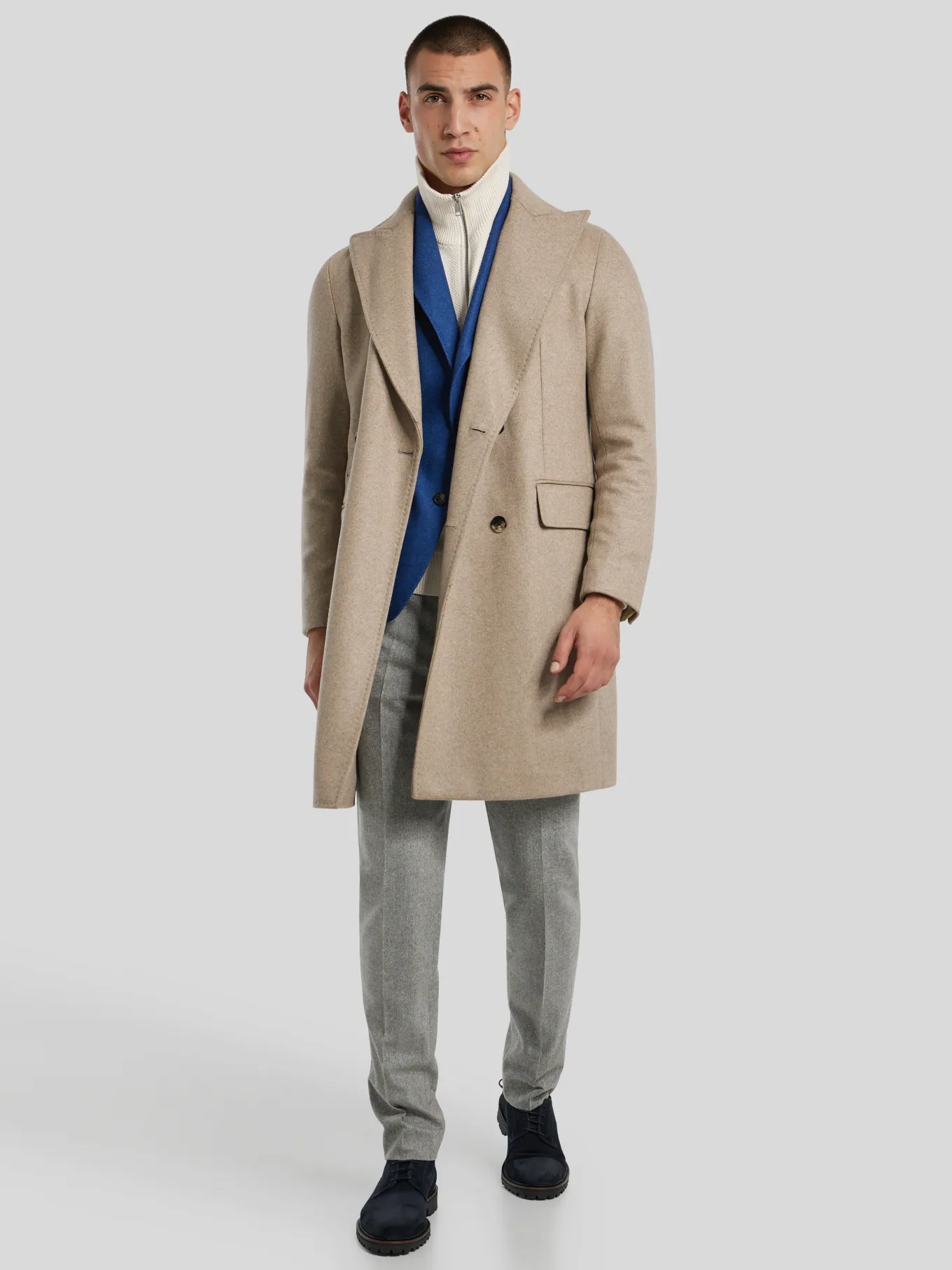 Unser Model misst 187 cm und trägt Grösse 48.