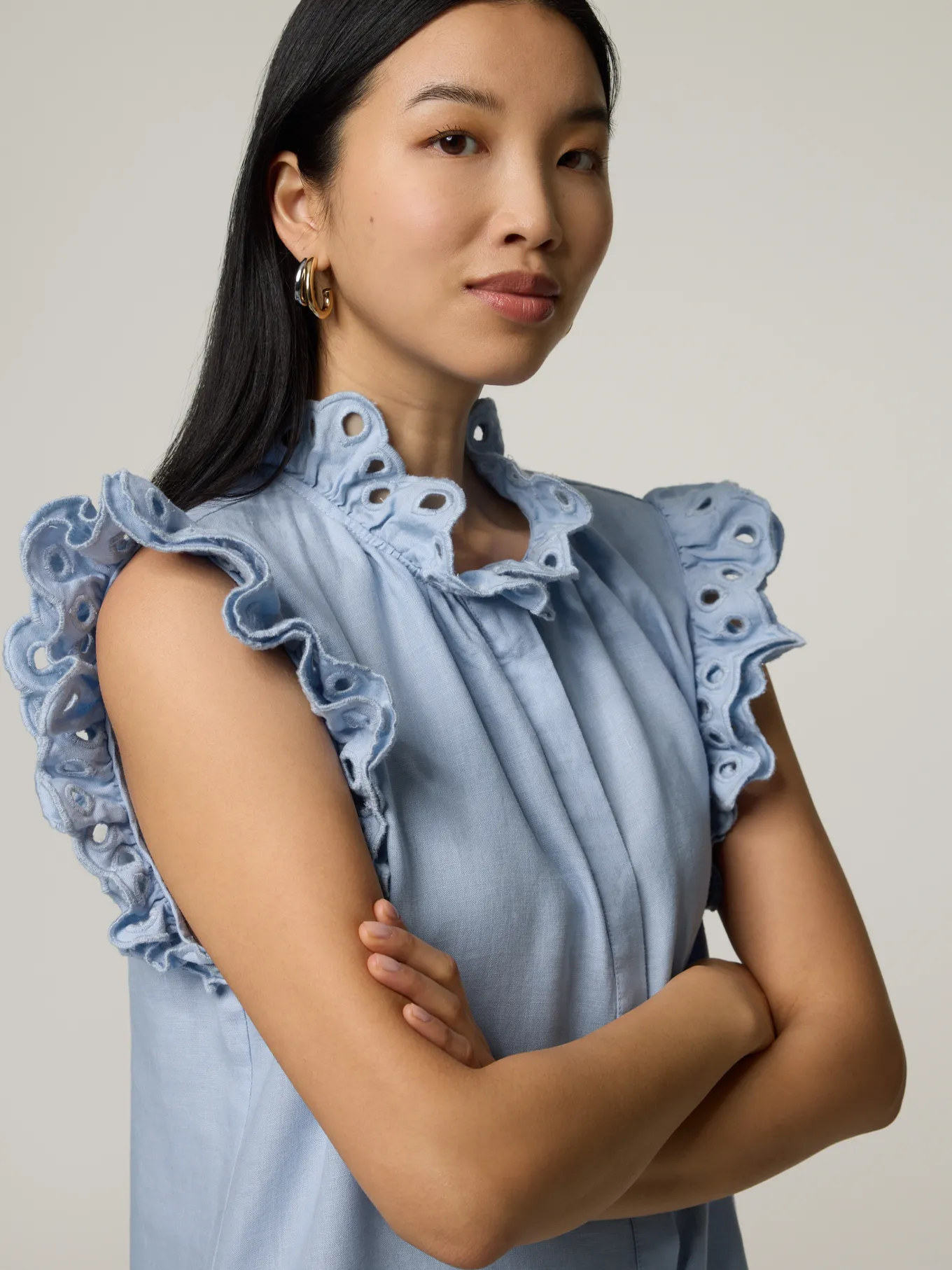 Unser Model misst 174 cm und trägt Grösse 36.