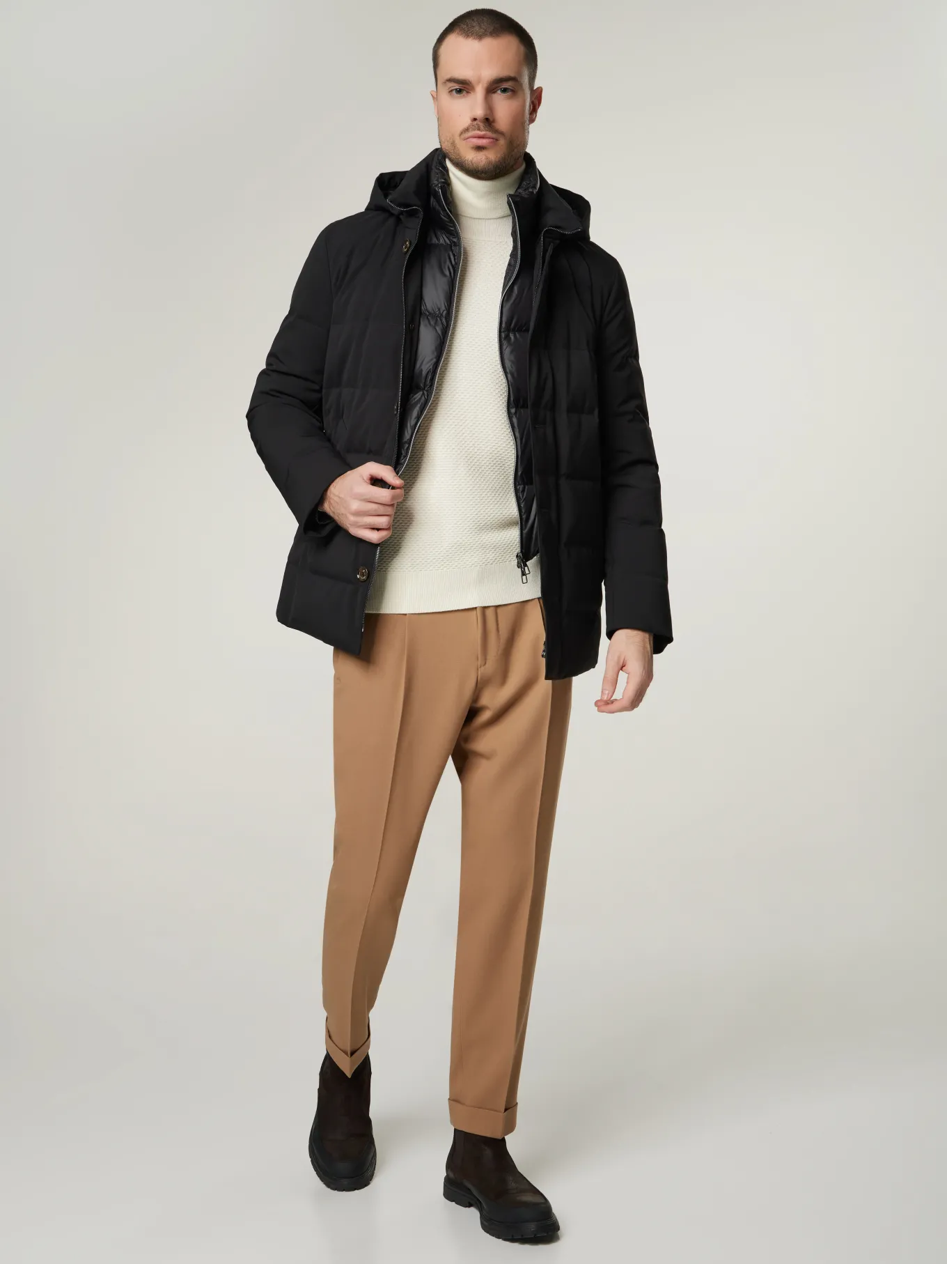 Unser Model misst 187 cm und trägt Grösse 50.