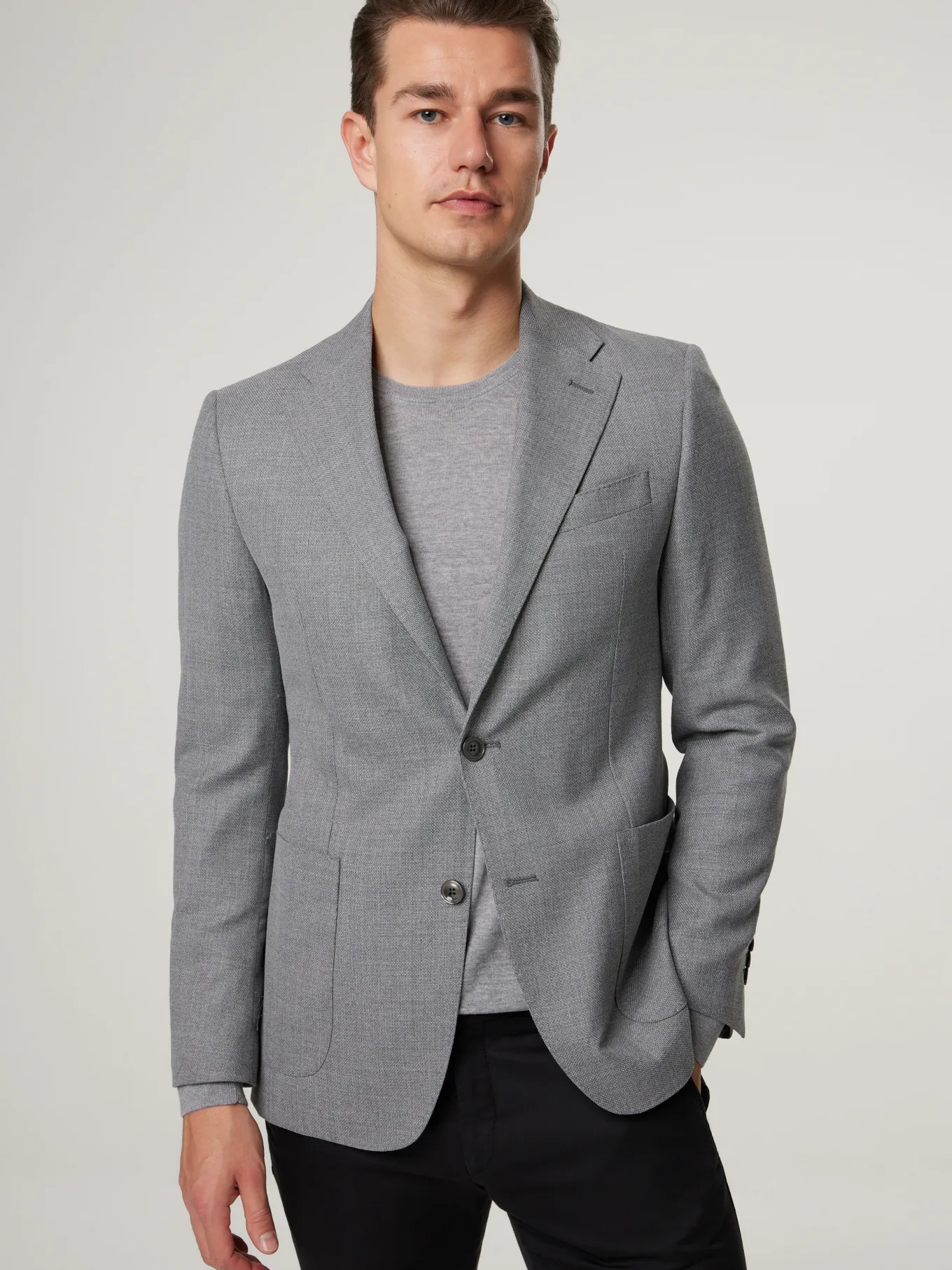 Unser Model misst 187 cm und trägt Grösse 48.