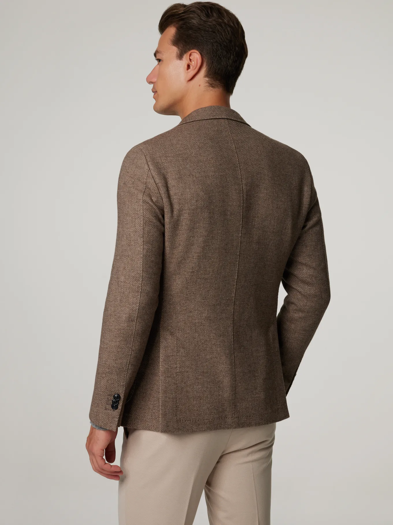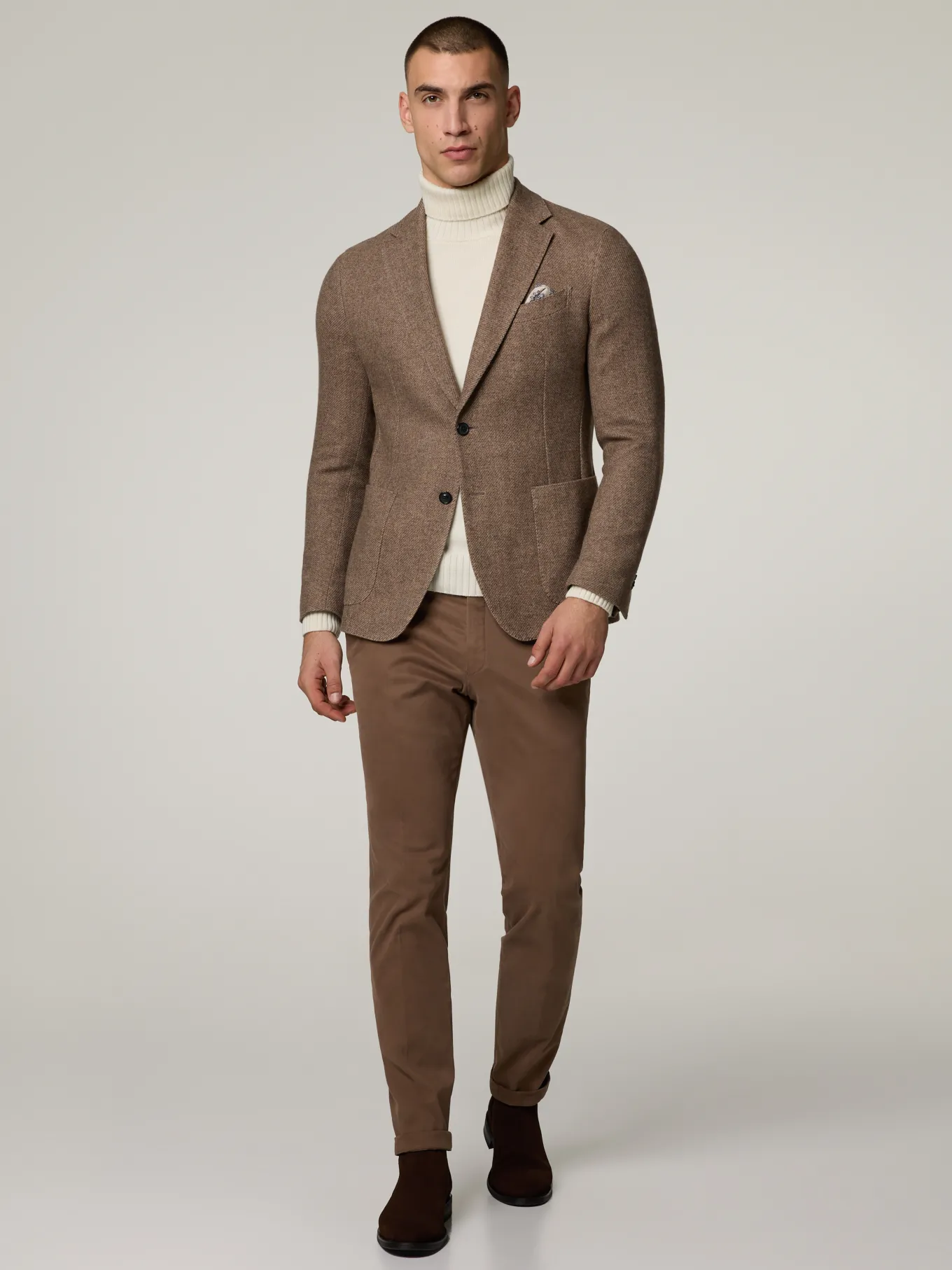 Unser Model misst 187 cm und trägt Grösse 48.