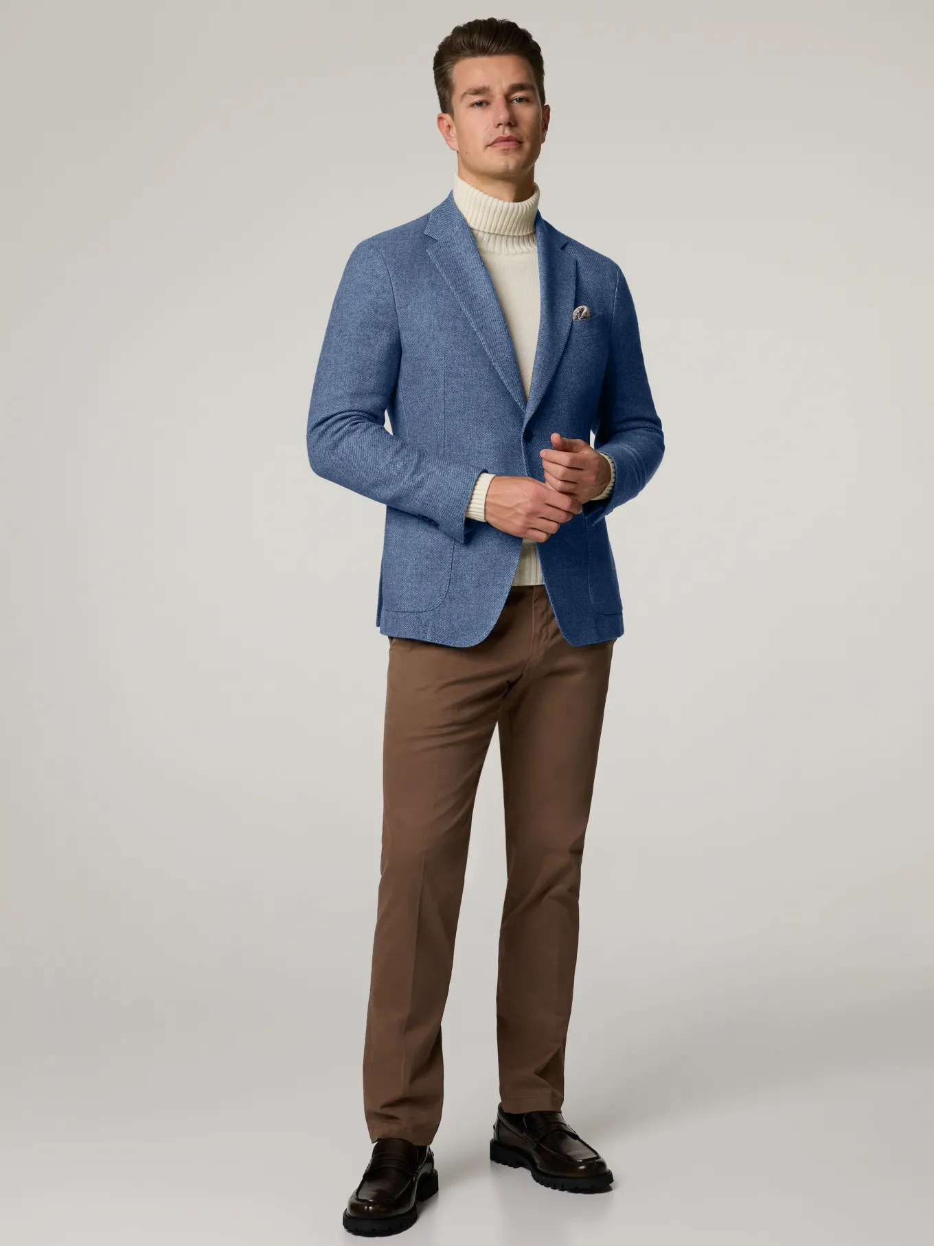 Unser Model misst 187 cm und trägt Grösse 48.