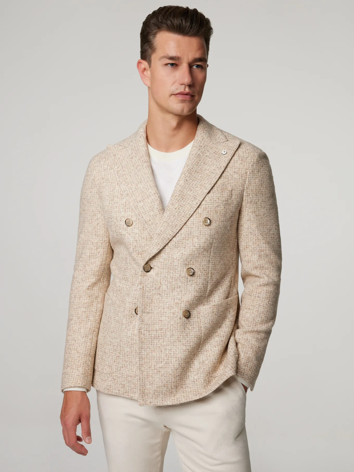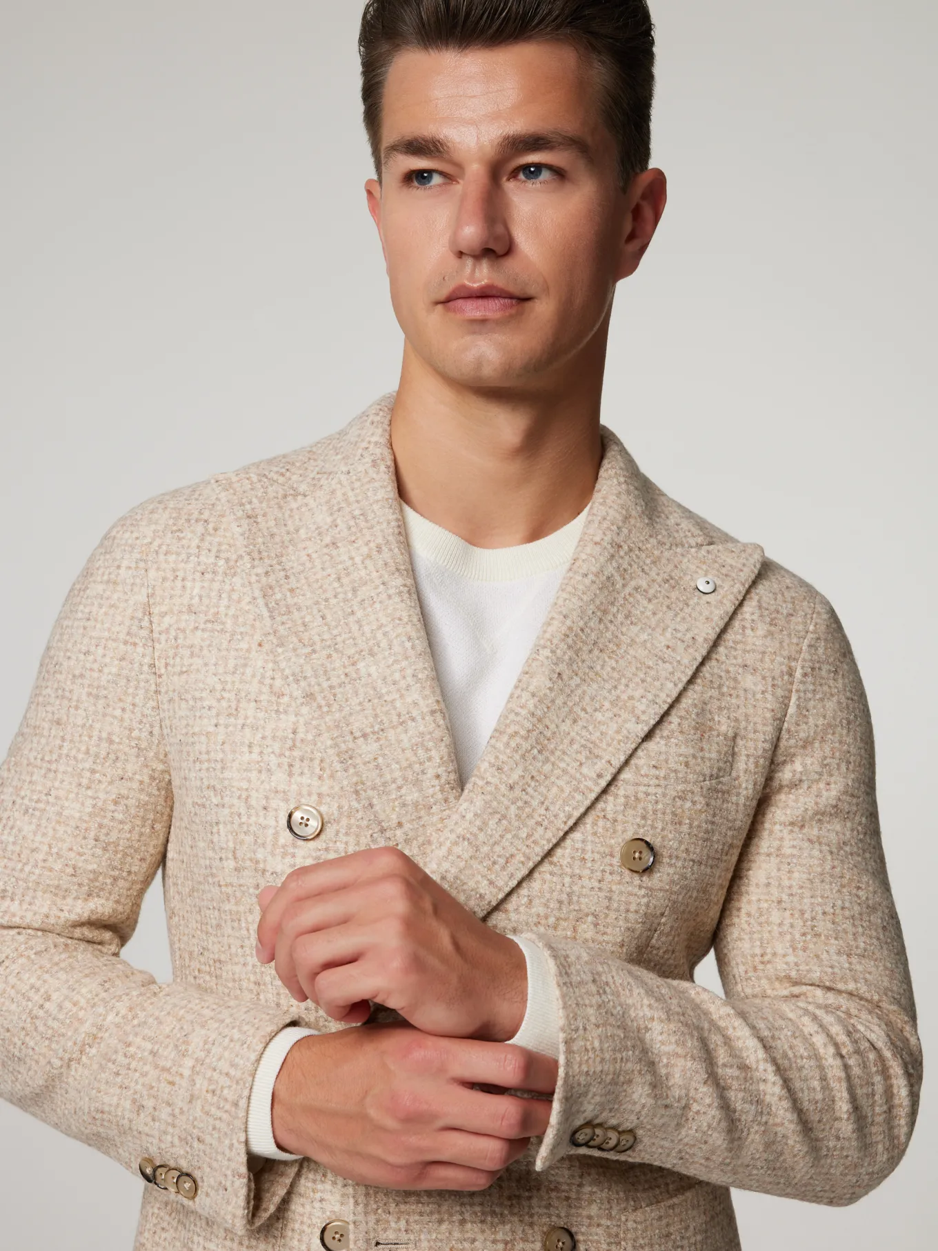 Unser Model misst 187 cm und trägt Grösse 48.